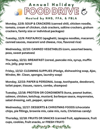The annual HCS Holiday Food Drive hosted by NHS, FFA, and FBLA begins this week. Donations from the community can be brought to home games or holiday concerts. Please see the graphic for needed items.