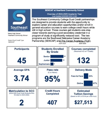 CLICK FOR SUMMARY GRAPHIC Included here are some summary statistics for Heartland High School's participation in the Southeast Community College SENCAP (Career Academy Partnership) during the 24-25 school year. Heartland has a long history of participating with SECC's SENCAP program where student's complete dual-credit courses (courses that provide both high school credit and college credit). . . .