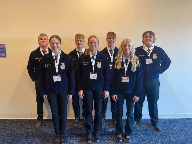 Seven Heartland FFA members attended the National FFA Convention, as well as two advisors: Braden Janzen (12), Madalyn Janzen (11), Weston Panko (12), Grace Splinter (12), Lane Farrall (12), Riley Quiring (12), Trenton Goertzen (12), Stephanie Miller (advisor), and Allison Engelman (advisor).